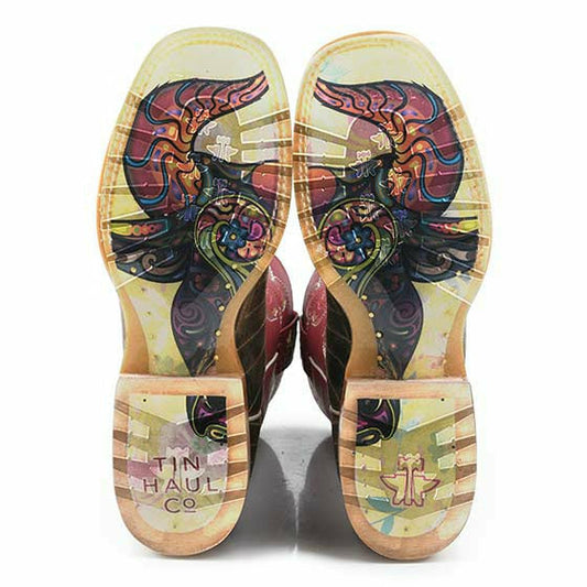 Botas Tin Haul Super Nova Star para mujer con suela dentada con diseño de bull doodles, hechas a mano en color tostado