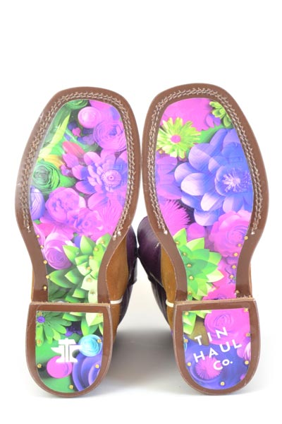 Botas de vaquera Let's Go de Tin Haul para niños con suela Flower Power, hechas a mano en color tostado