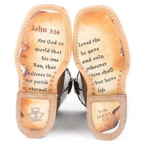 Botas cruzadas de Tin Haul para niños con suela Jonh 3: 16 en color tostado artesanal