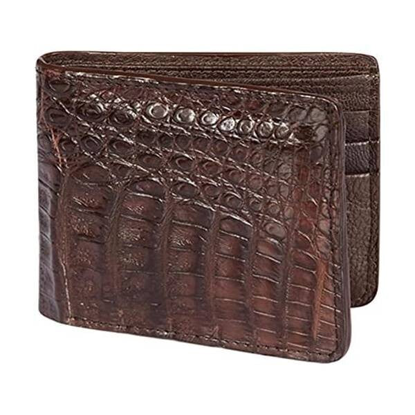 Cartera de piel de cocodrilo marrón con dos compartimentos para tarjetas, compartimento para identificación y compartimento para billetes. Hecha a mano.