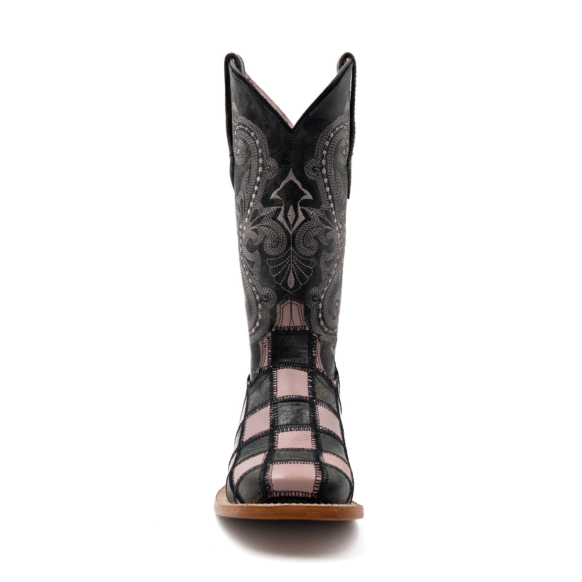 Women's Ferrini Patchwork Leather Boots Handcrafted Square Toe Black Pink